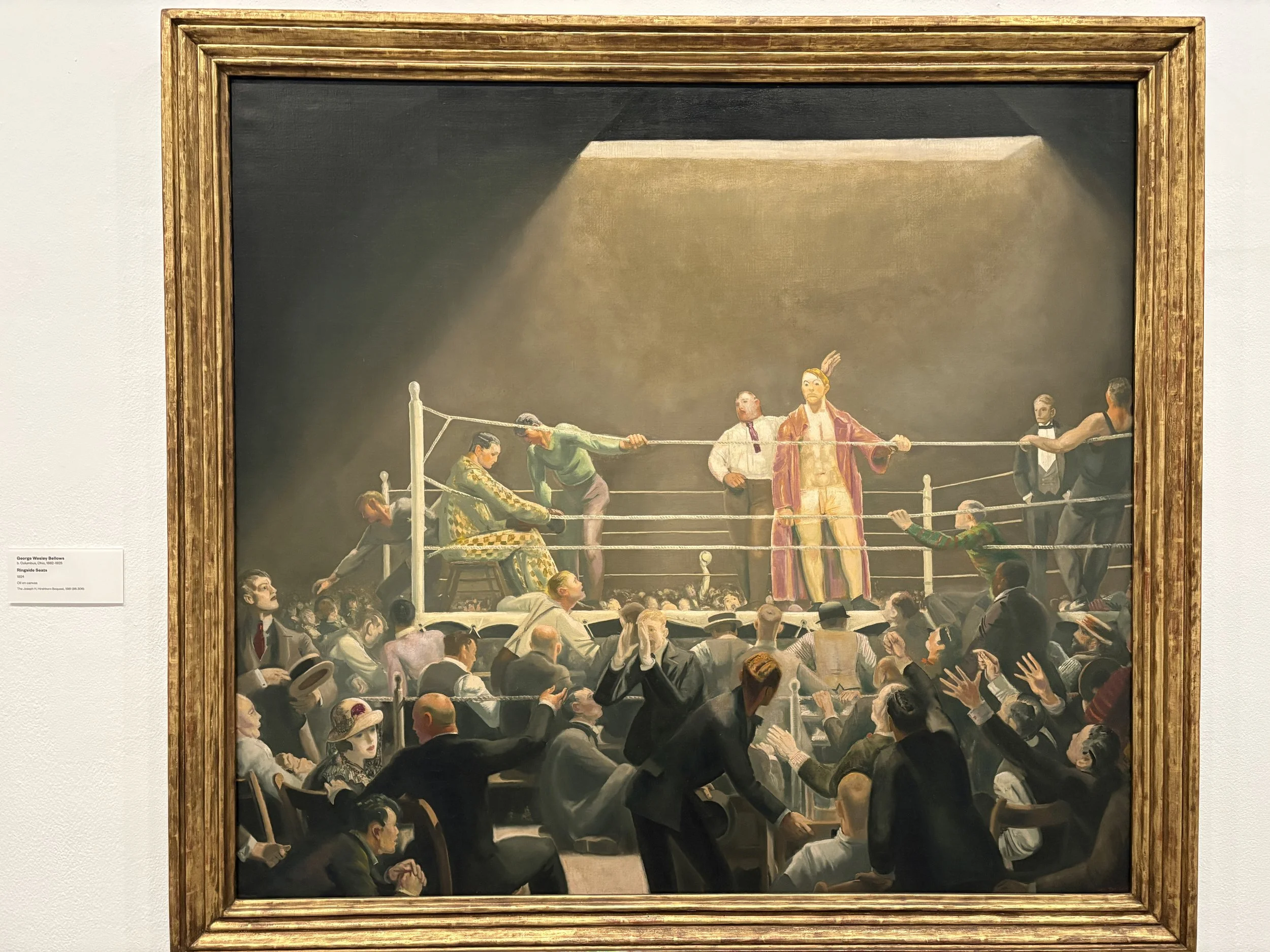 I find myself pressed tightly among the crowd in Ringside Seats by George Wesley Bellows, my view fixed on the violent spectacle unfolding just a few feet away. The ring feels almost too close, as though I could reach out and touch the ropes or feel the spray of sweat from the fighters. The two boxers are locked in motion, their bodies twisting and colliding under the harsh glare of the overhead lights. I can sense the force of each blow, even though I am only a spectator. Their muscles strain, their faces blur with effort, and their movements seem both frantic and deliberate, like a dance driven by instinct and survival.